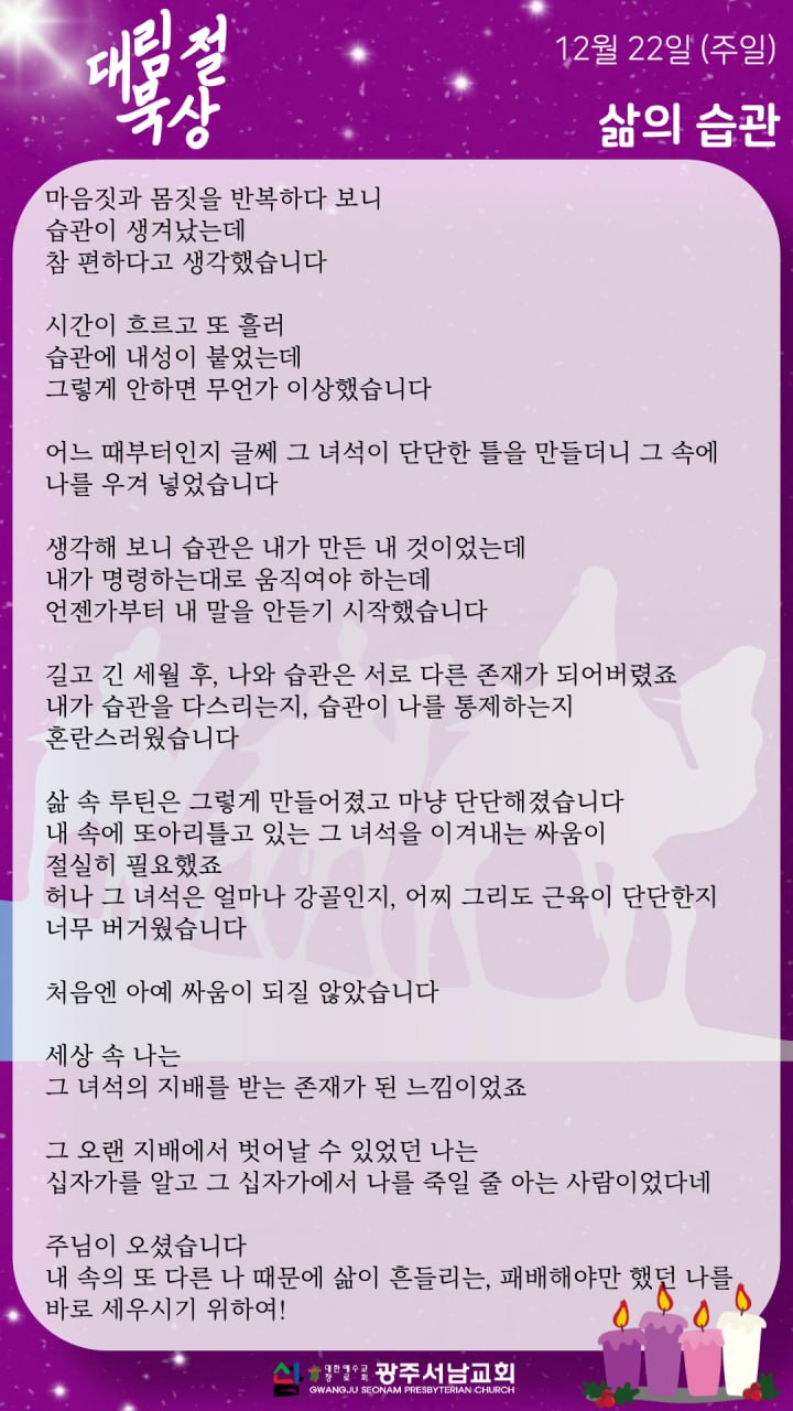 이 땅에 평화를 주시기 위하여 오신 예수님을 따라 우리도 평화를 전할 수 있기를 바랍니다. |