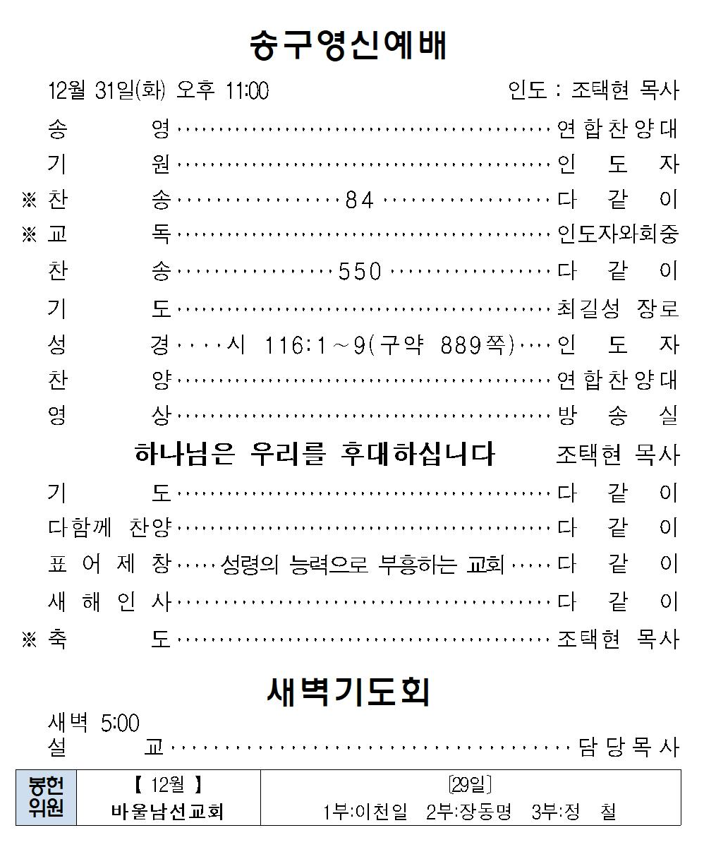 지난 한 해 동안 넉넉하고 풍부한 그리고 정성을 다해 최선을 다해 극진히 우리를 보살펴 주신 하나님을 찬양합니다. 우리 스스로 신앙고백적으로 다음과 같이 말할 수 있습니다: "내 영혼아 네 평안함으로 돌아갈지어다".