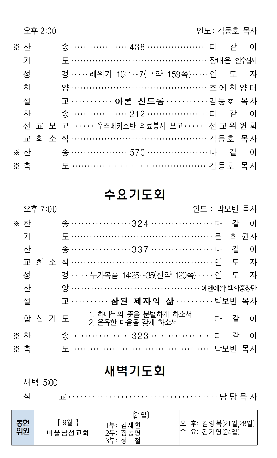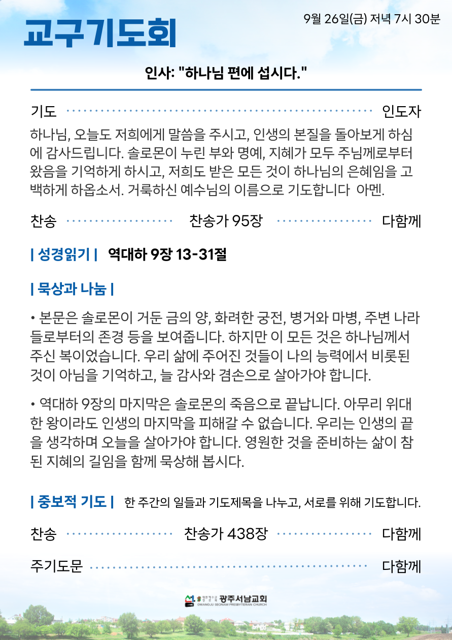 2. 다음주 금요기도회(26일)는 교구기도회로 저녁 7시 30분에 각 교구별로 모입니다.