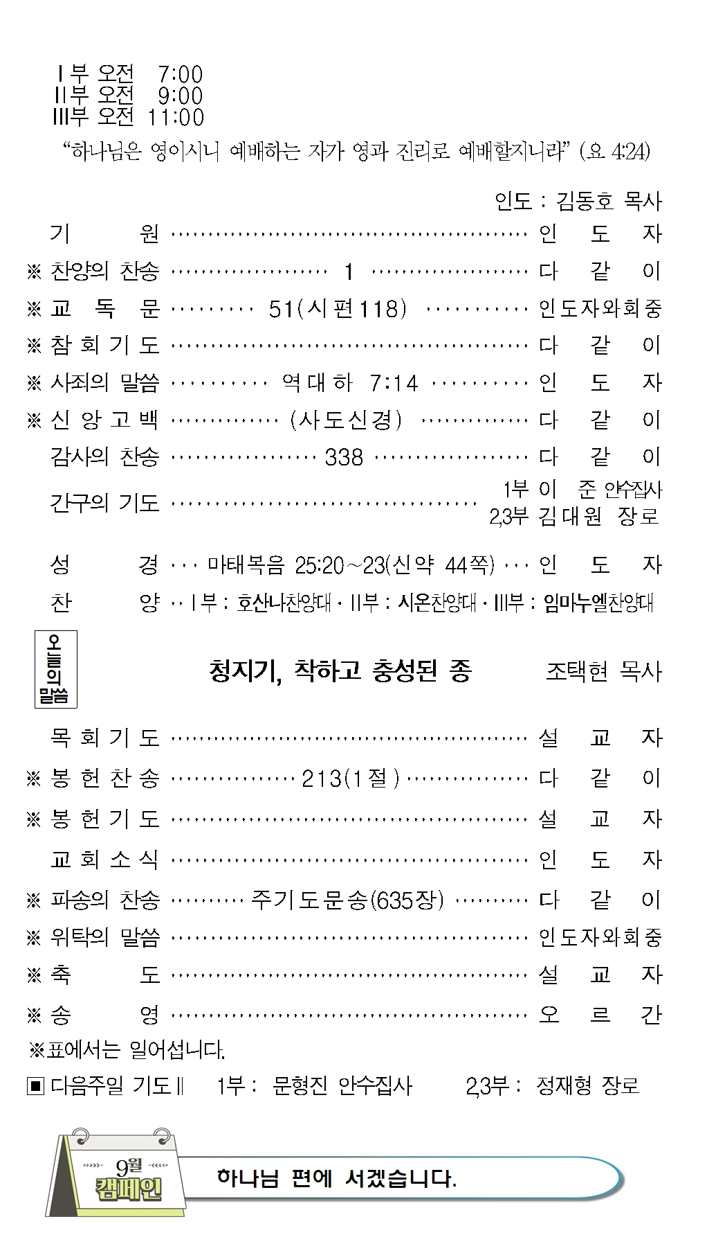 7. 대학수학능력시험 중보적기도 신청을 9월 28일(주일)까지 받습니다. 신청서는 안내석에 있습니다.