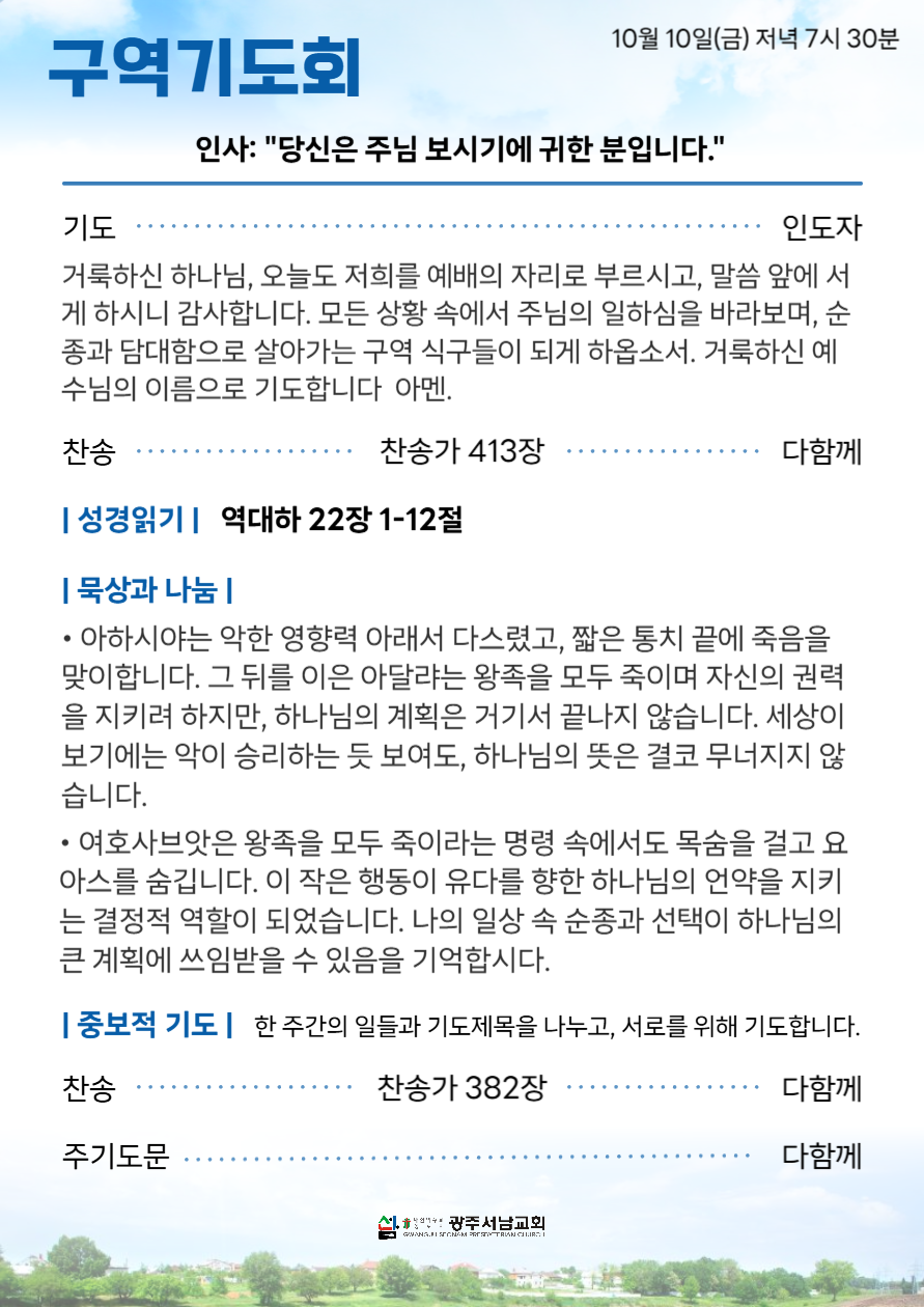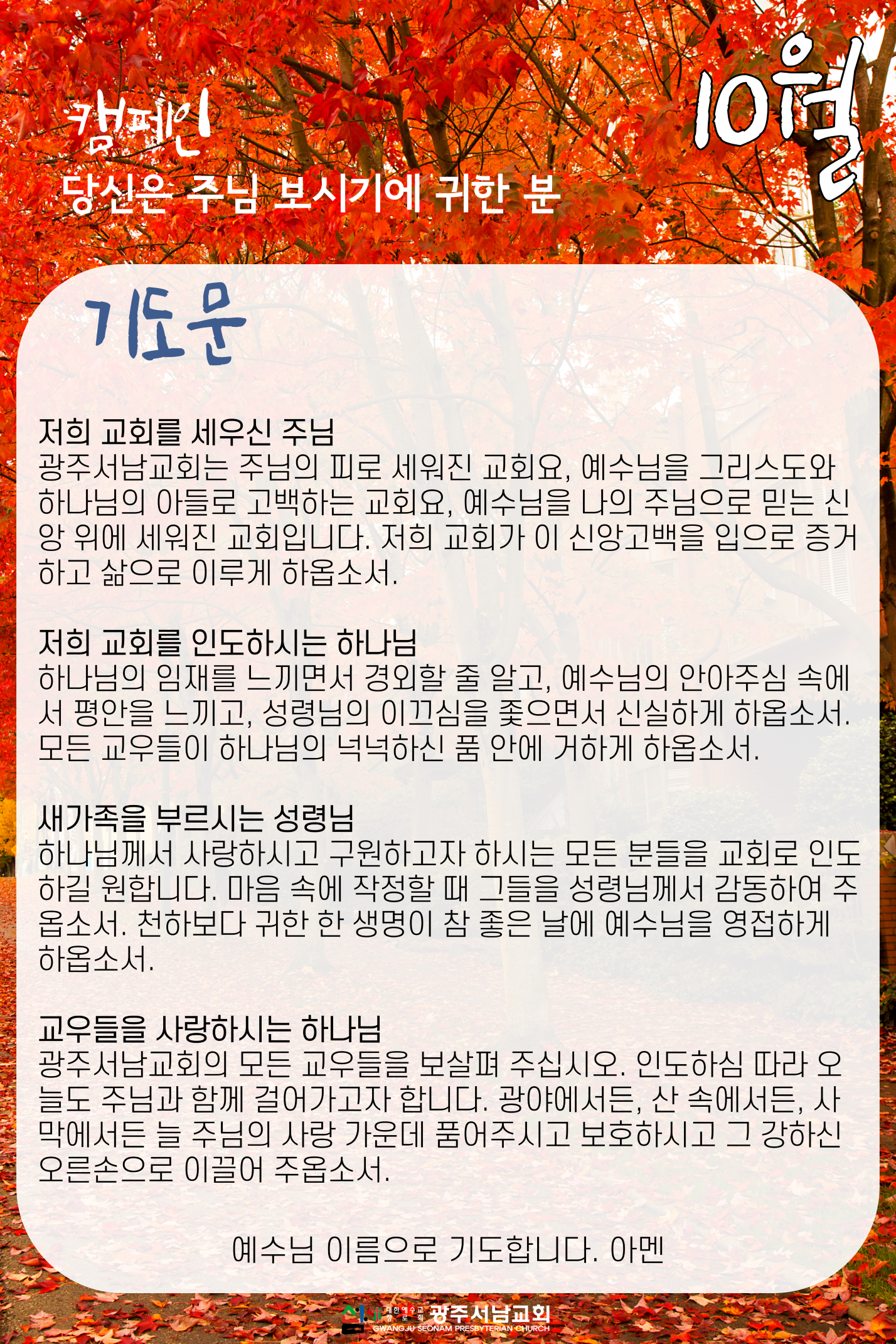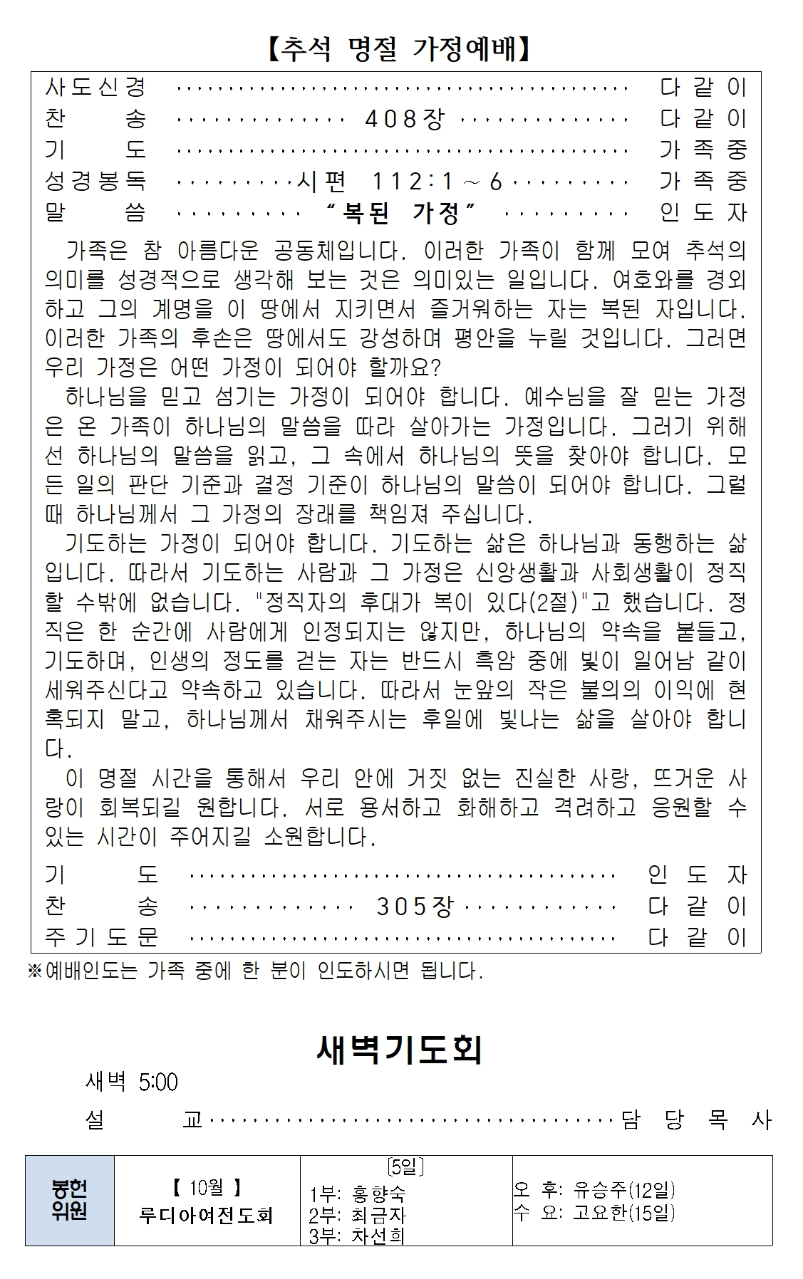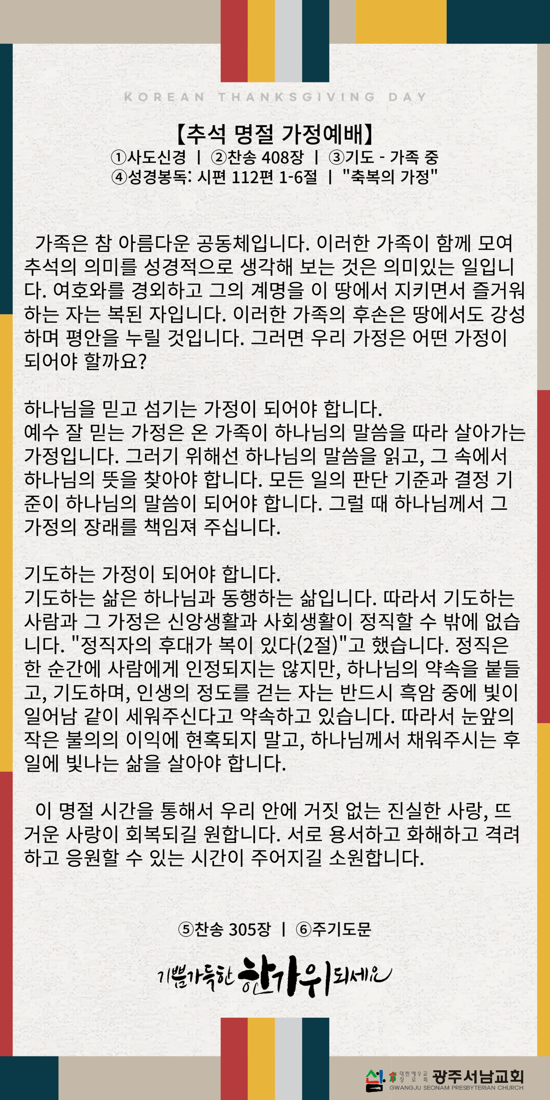 #)세속적 명절이 아니라 하나님께 예배드리는 신앙의 명절을 세워야 합니다. 하나님을 중심에 모시고, 가족과 친지, 이웃과 함께 교제할 때 명절은 더욱 귀해집니다. 일상 속에서도 하나님과 사람을 향해 마음을 열어 신앙과 삶을 함께 살아내야 합니다. 그렇게 할 때 추석은 하나님과 화목하고 사람과 평화하는 성경적 명절이 됩니다. |