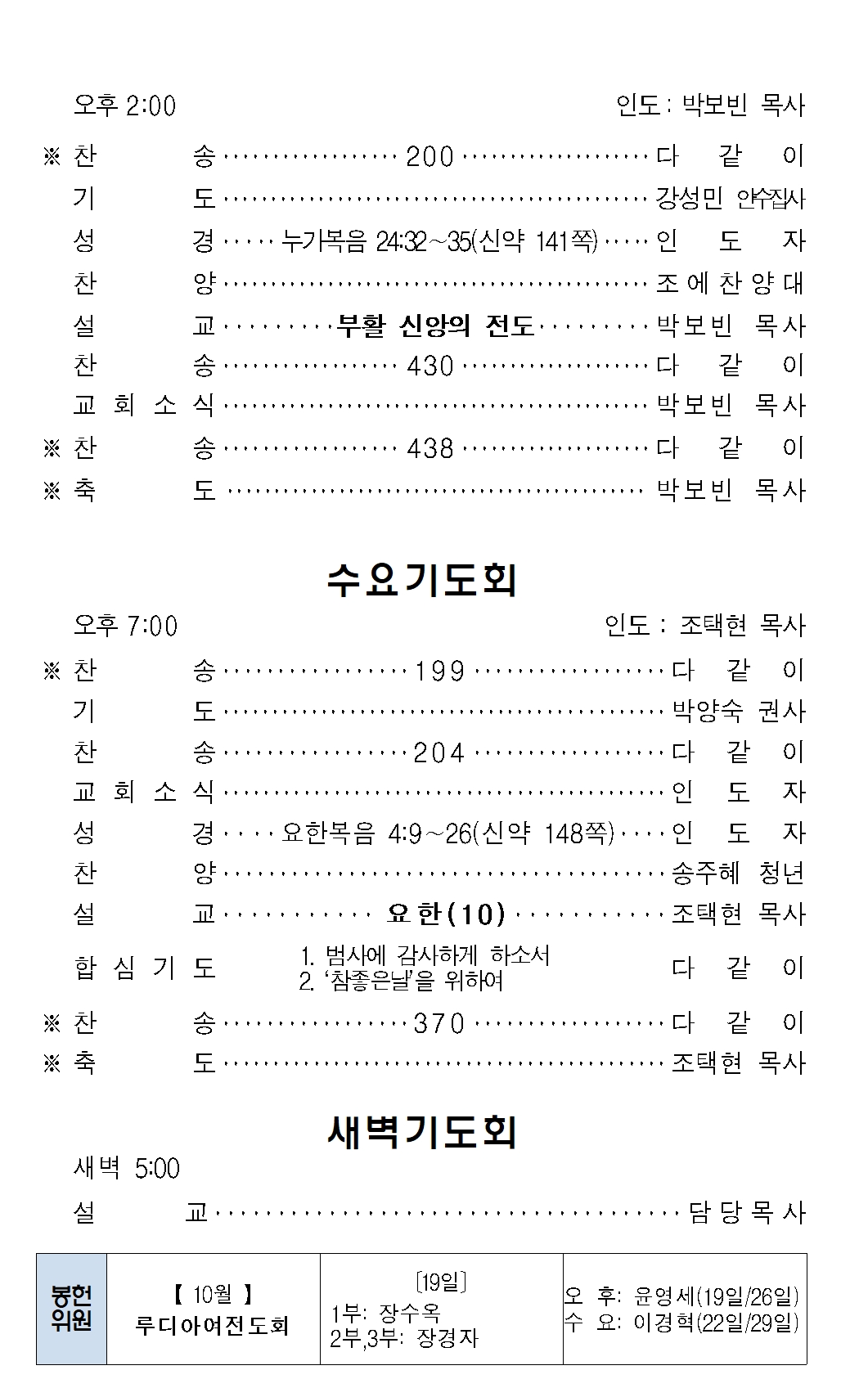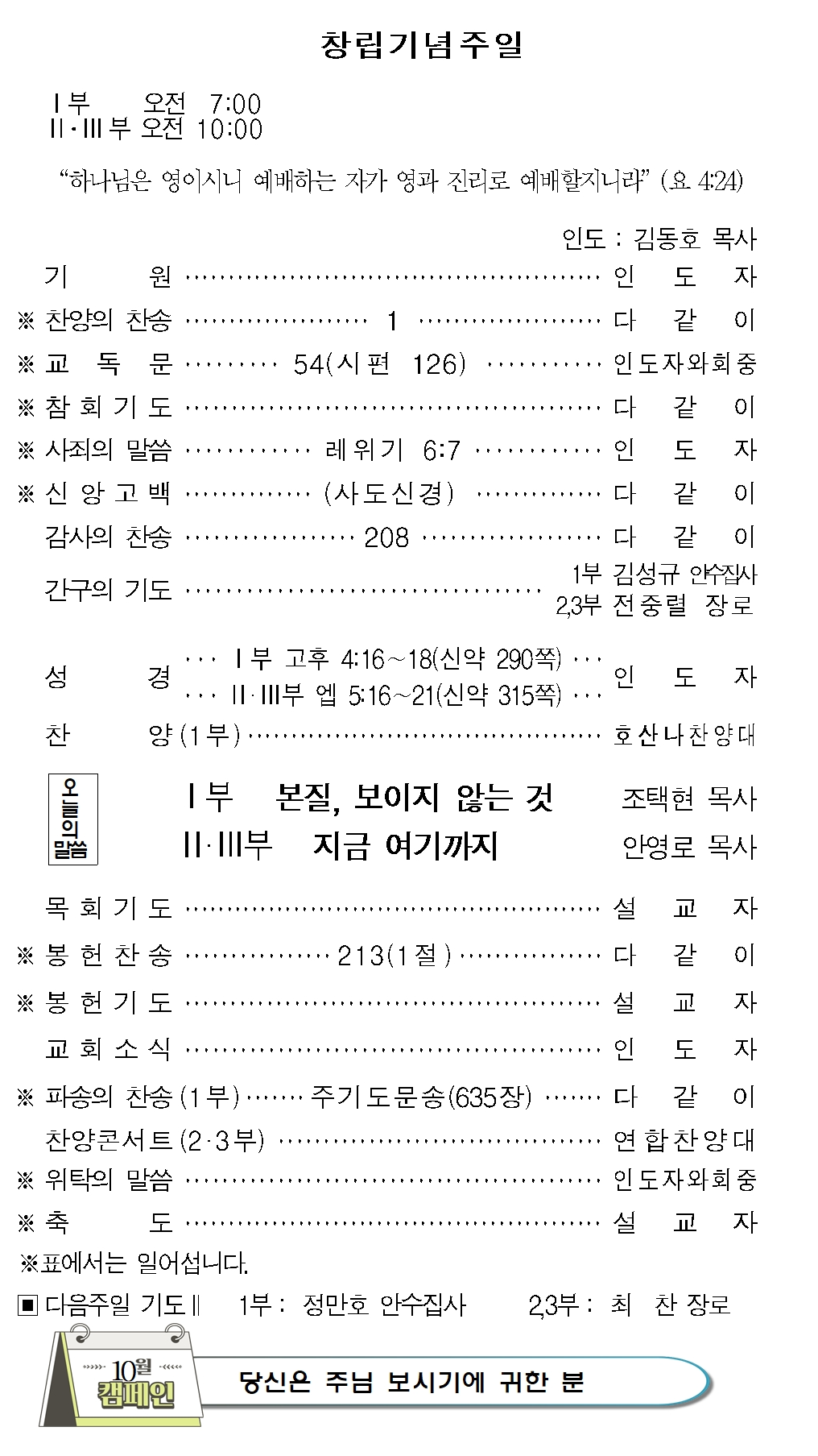 - 10월 정기당회 및 2차 정책당회는 10월 26일(주일)에 있습니다.