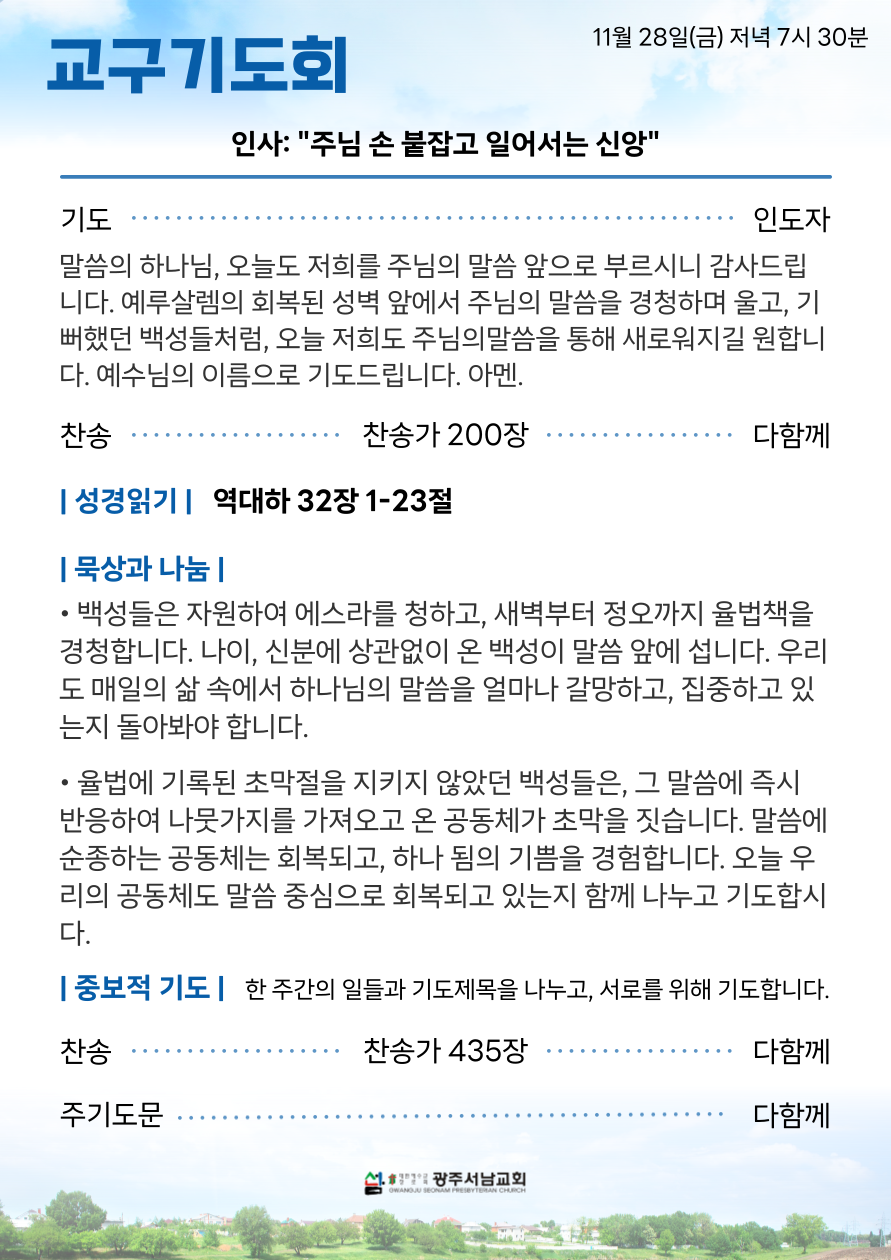 4)이 모든 것은 마음이 둔해지지 않기 위함입니다. 예수님은 “싹이 나면 보고 알라”고 하셨습니다. 먼저 보는 자만이 알 수 있습니다. 나 자신을 신앙의 눈으로 보면, 그 안에서 하나님의 뜻을 알게 됩니다. 하나님 나라는 멀리 있지 않고 지금 내 안에서 이루어지고 있습니다.
