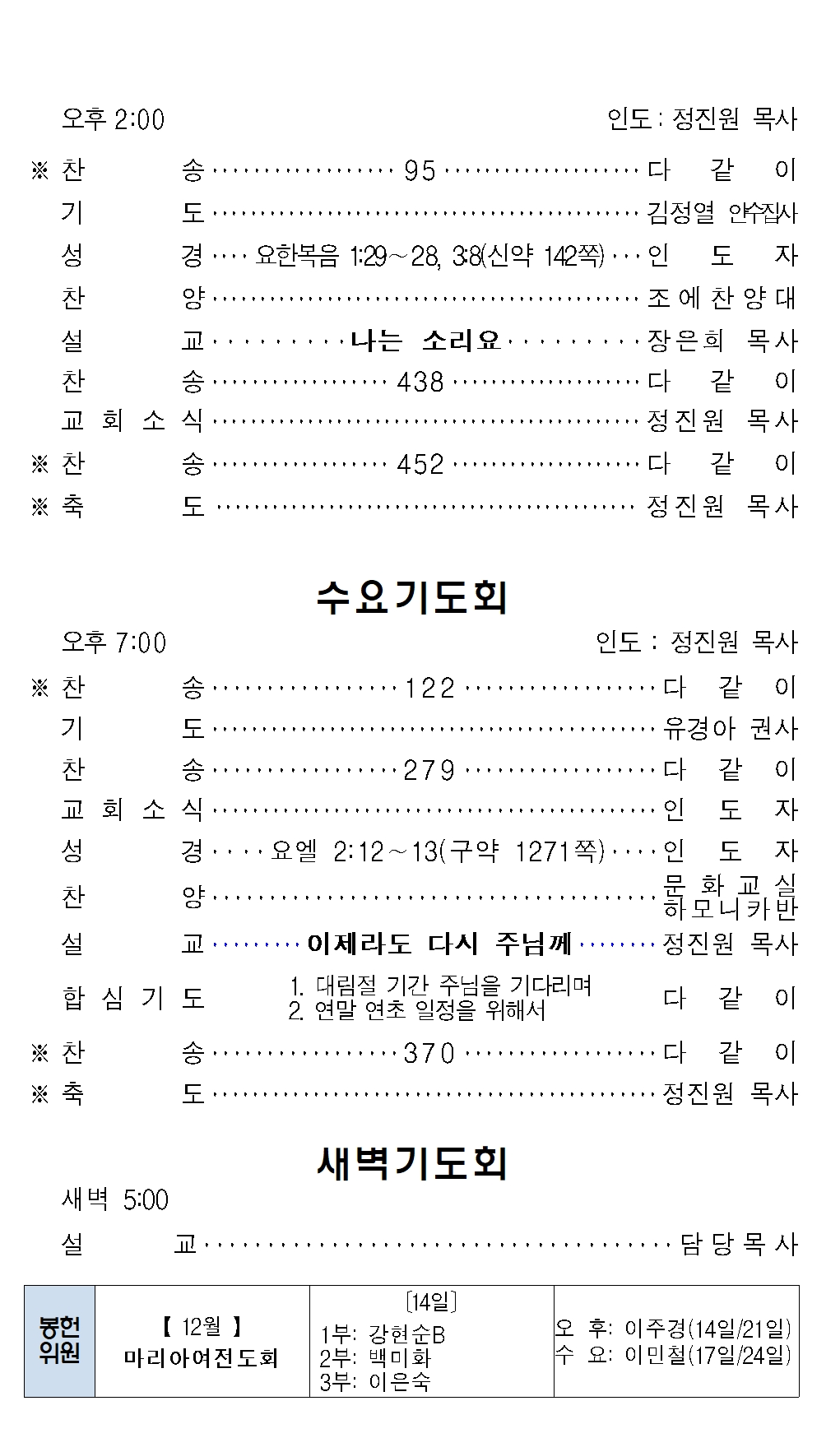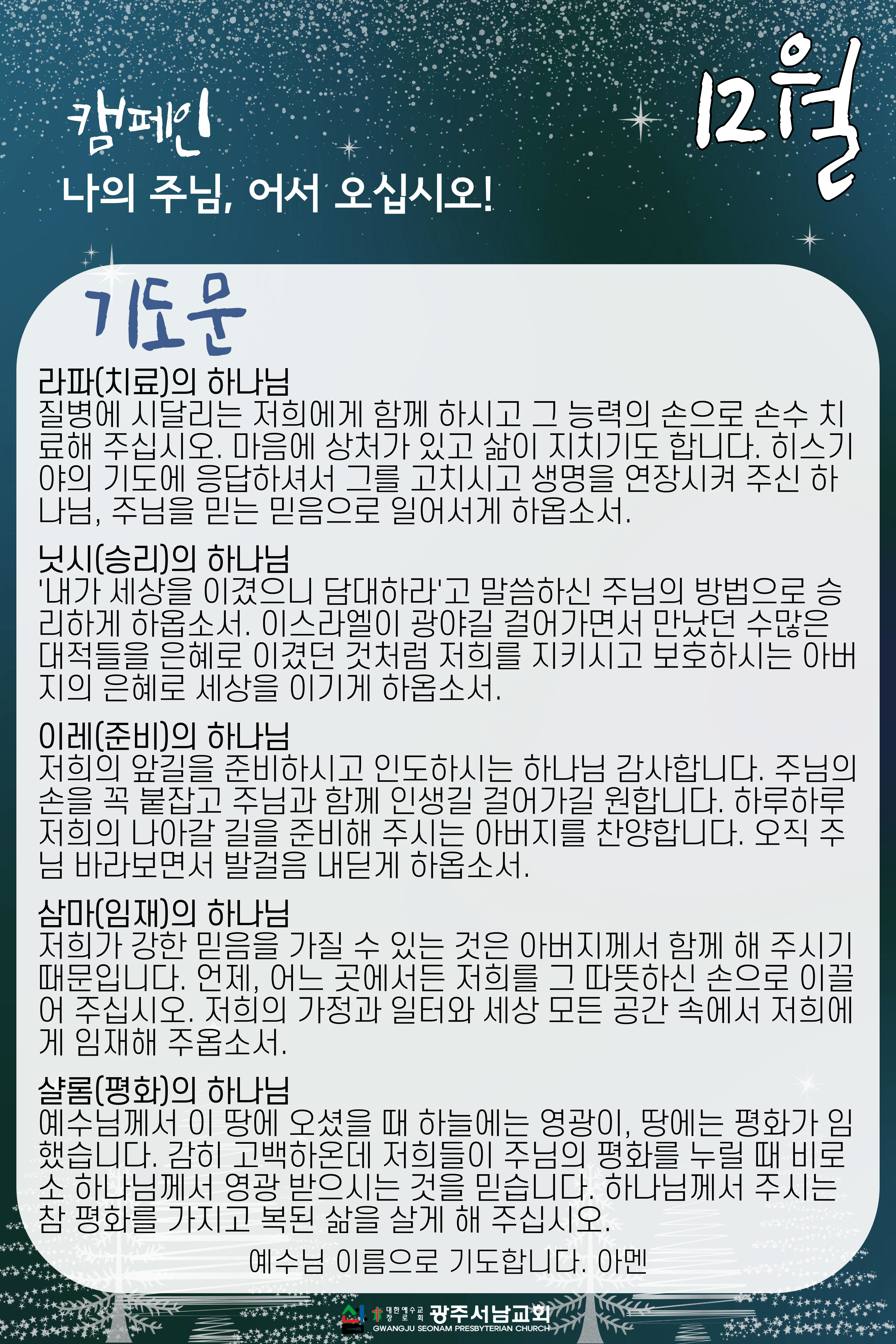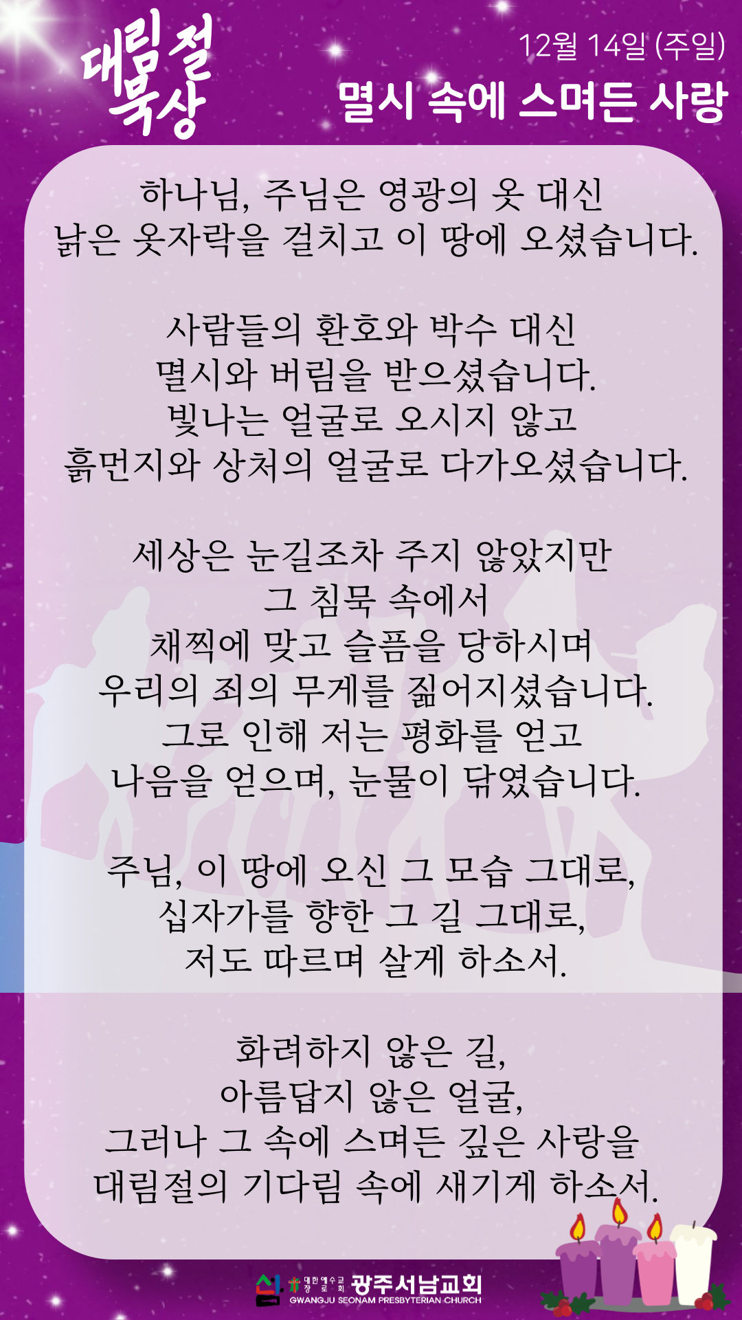 5)이제 성탄절까지 약 열흘이 남았습니다. 주님을 기다리는 이 대림절 기간, 우리의 삶은 깨끗하고 흠이 없게, 우리의 신앙은 맑고 순수하게, 그렇게 의로운 모습으로 아기 예수님을 기다리는 대림절이 되기를 소망합니다.
