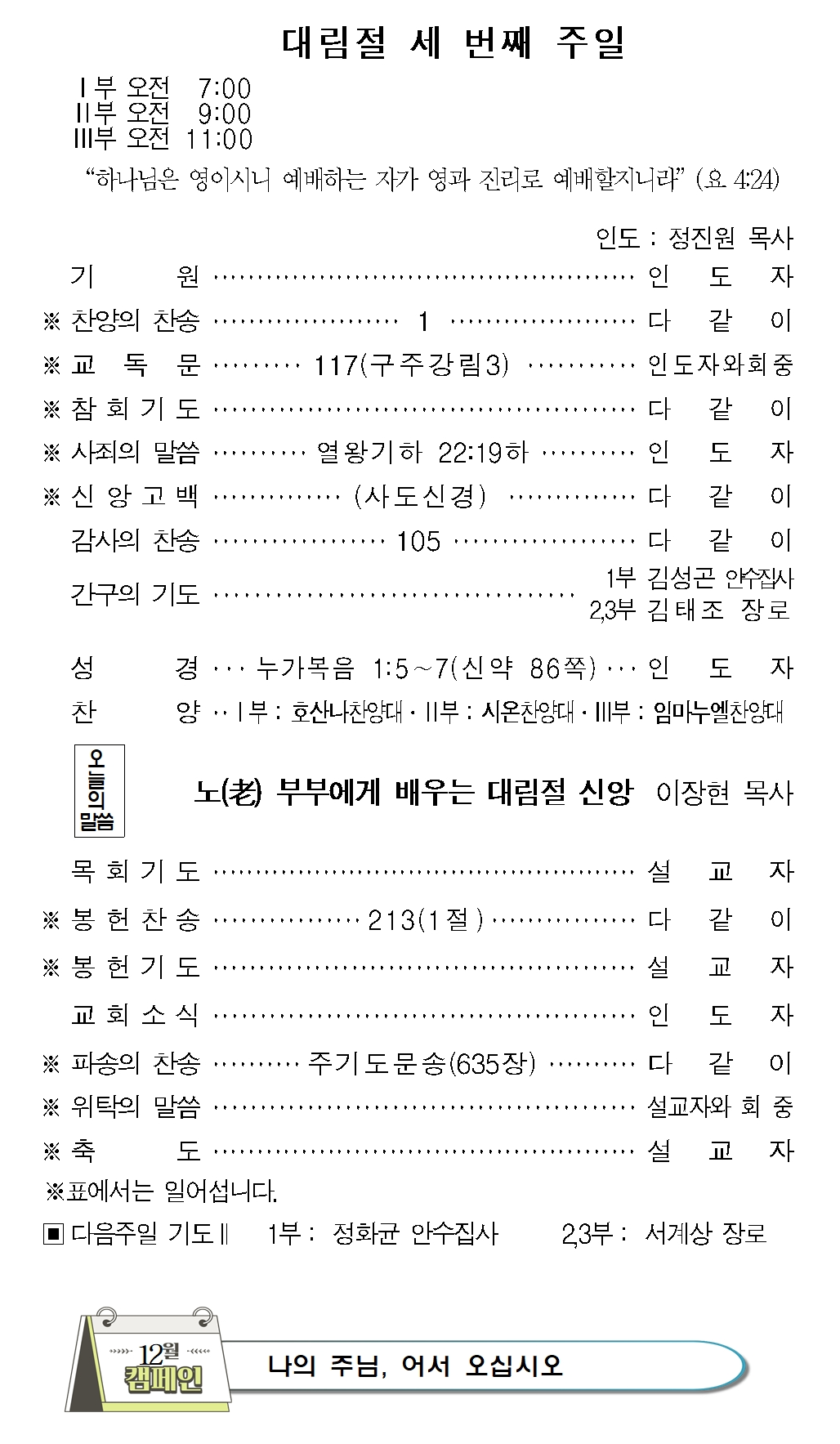 교회력으로 우리는 지금 대림절을 보내고 있습니다. 이 기간에 우리는 어떤 신앙으로 주님을 기다려야 할까요? 한 노부부, 사가랴와 엘리사벳의 신앙을 통해 그 지혜를 얻고자 합니다.